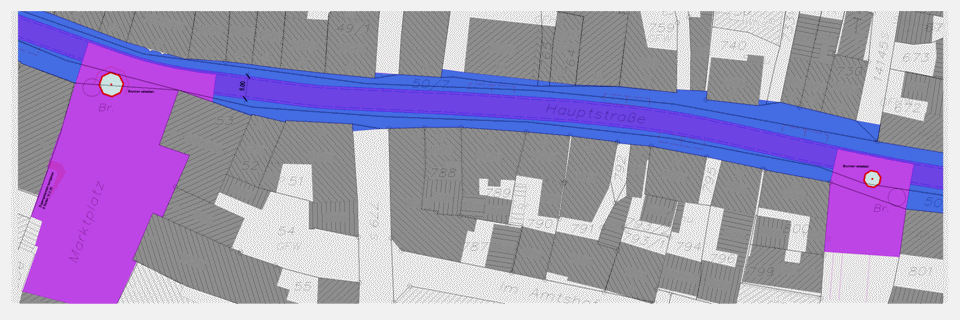 wird über die Fahrbahn der Hauptstraße hinweg bis zum gegenüberliegenden Gehweg verlängert.