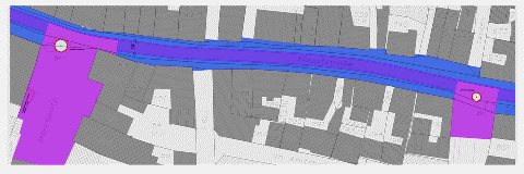 Die Fahrbahn der Hauptstraße wird durch die jeweiligen Brunnenplätze unterbrochen. Das Katzenkopfpflaster der beiden Plätze