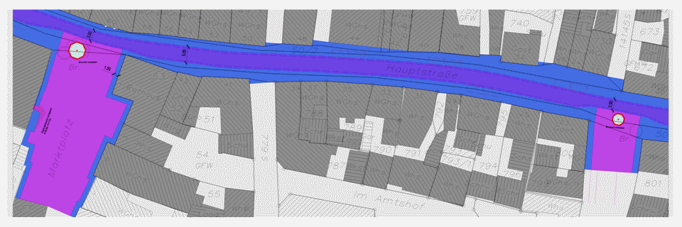 Die Fahrbahn der Hauptstraße wird im Bereich der Brunnenplätze auf 3,50 m Breite verengt. Das Katzenkopfpflaster der beiden Plätze wird jeweils bis an die