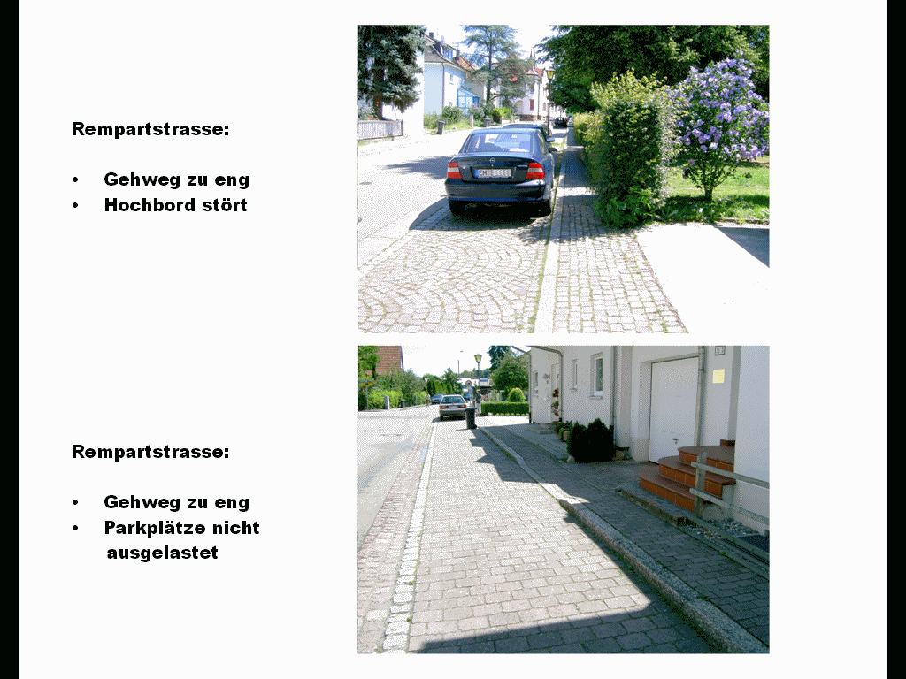 Rempartstraße: Parkplätze nicht ausgelastet, Gehweg zu eng. |