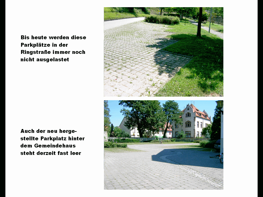 Bis heute (Juli 2004) werden, wie das obere Foto zeigt, diese Parkplätze in der Ringstraße immer noch nicht ausgelastet