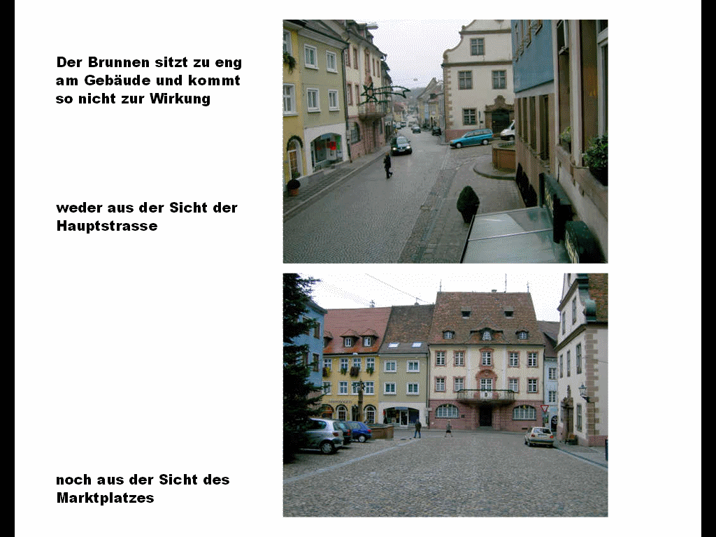 Der Brunnen sitzt zu eng am Gebäude und kommt so nicht zur Wirkung, weder aus der Sicht der Hauptstrasse